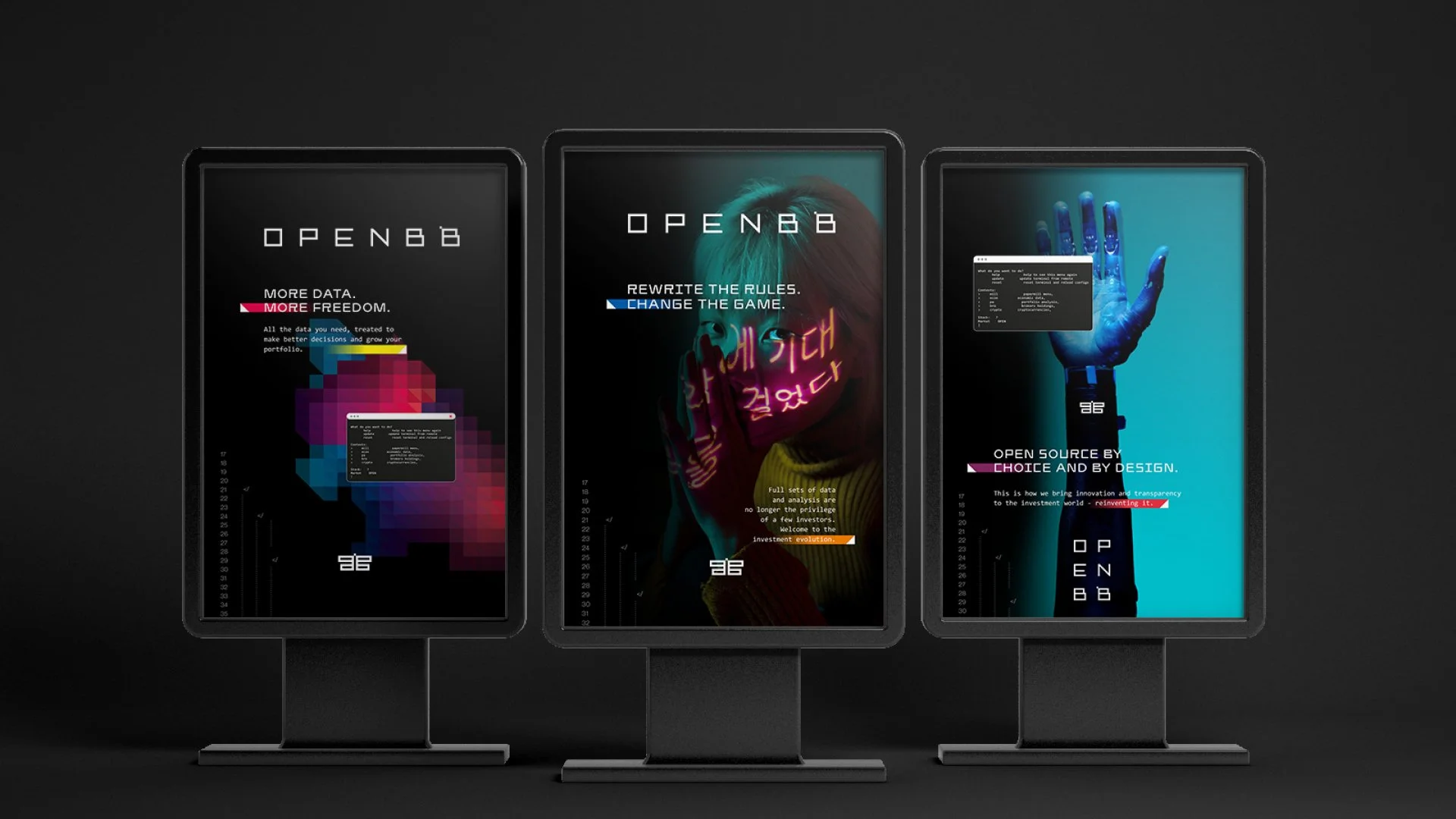 We developed OpenBB branding with a unique visual aesthetic, to distance it from the usual financial corporations, and with relation to the products they sell.